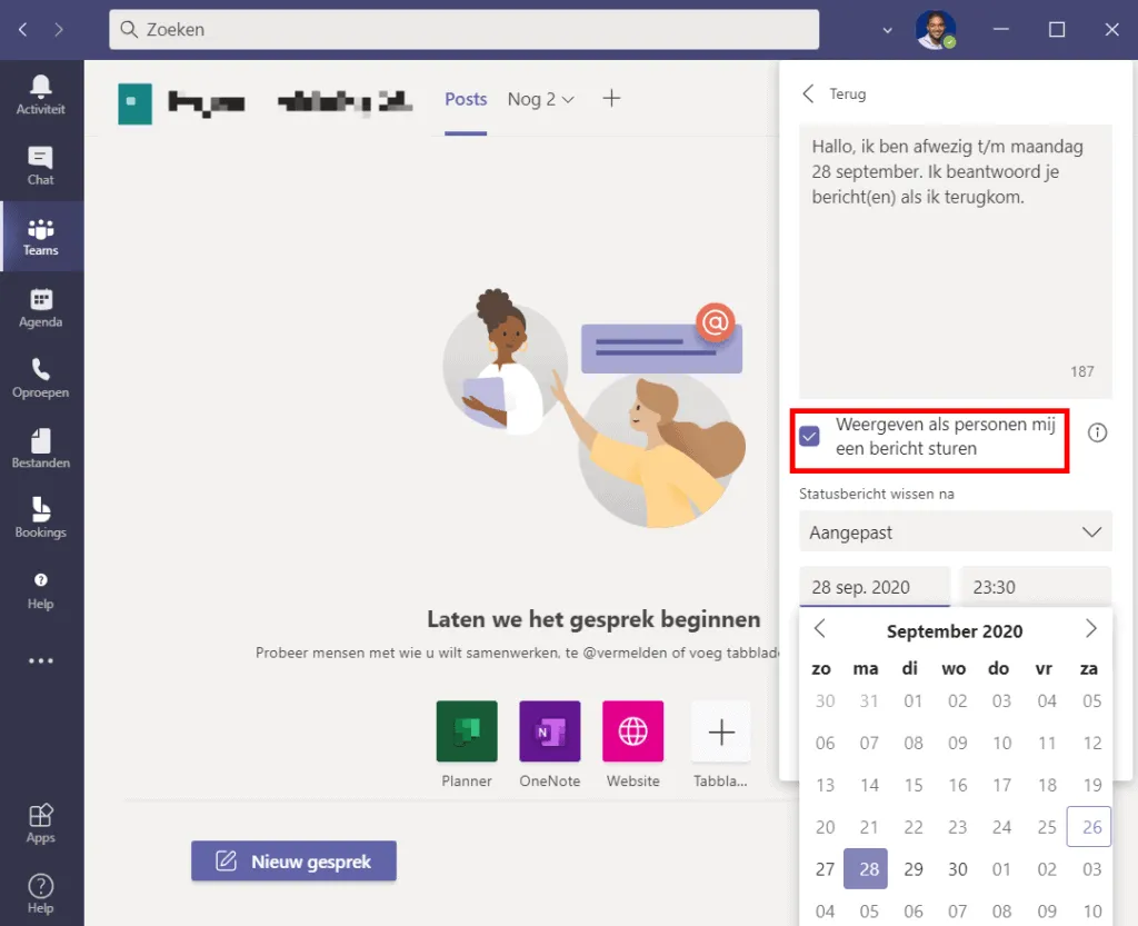 Afwezigheidsbericht instellen in Microsoft Teams.