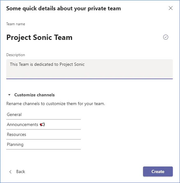 Er is een breed scala aan ingebouwde sjablonen direct beschikbaar en aangepaste sjablonen kunnen helemaal opnieuw worden gemaakt of door de structuur van een bestaand team te kopiëren. Dit betekent dat de meest voorkomende use-cases voor uw organisatie vooraf kunnen worden gedefinieerd en aangeboden als een ‘catalogus’. Een organisatie die bijvoorbeeld meerdere acquisitieprojecten doorloopt en Teams gebruikt om het proces te beheren, kan vooraf een sjabloon definiëren om ervoor te zorgen dat de verstrekte structuur identiek is voor elk project, zelfs als er verschillende teamleden bij betrokken zijn. Wanneer een team wordt ingezet via een sjabloon, kan het vervolgens worden aangepast en bijgewerkt, maar het oorspronkelijke object blijft altijd hetzelfde. Het implementeren van sjablonen is vrij eenvoudig en eindgebruikers kunnen een voorbeeld bekijken van wat ze inrichten voordat ze zich committeren aan het maken van het team: