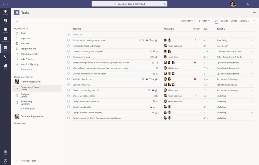 De Tasks-app biedt een samenhangende taakbeheerervaring voor Microsoft Teams, waarbij individuele taken die worden aangedreven door Microsoft To Do en teamtaken die worden aangedreven door Planner, op één plek worden geïntegreerd. Gebruikers hebben toegang tot Taken als een app aan de linkerkant van Teams en als een tabblad in een kanaal binnen individuele teams. Met Mijn taken en Gedeelde plannen in Taken kunnen gebruikers al hun individuele en teamtaken bekijken en beheren en hun werk prioriteren. Taken is beschikbaar in de desktop-, web- en mobiele clients van Teams.