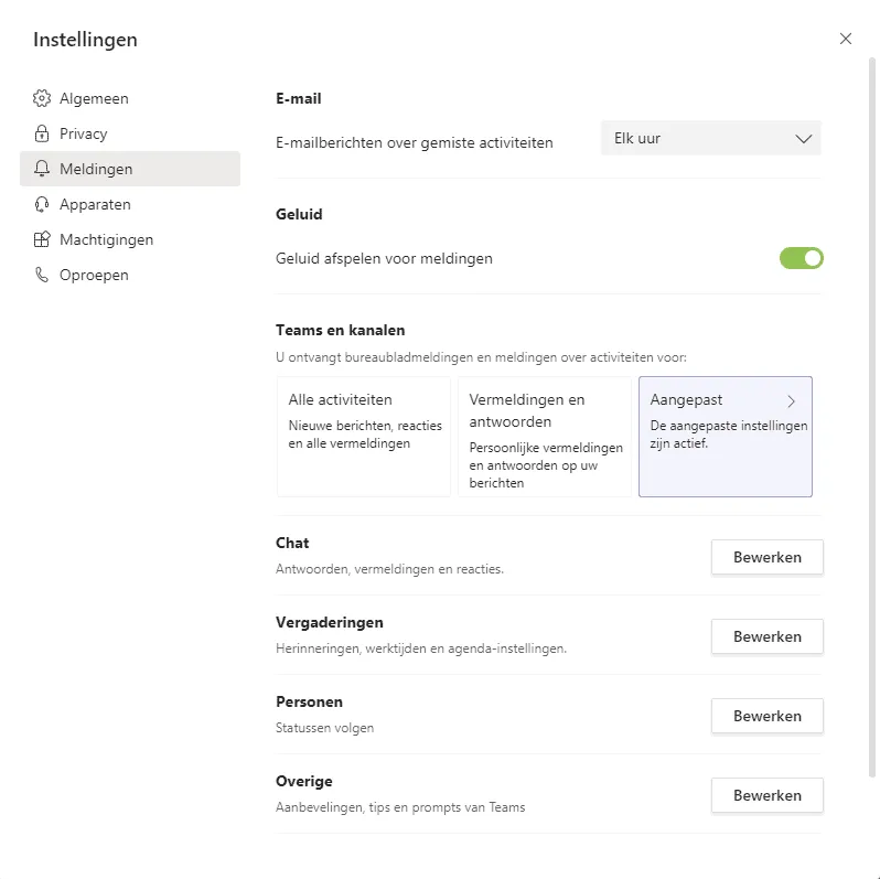 Het nieuw ontworpen instellingengedeelte voor meldingen biedt veel aanpassingsopties, zoals e-mail, geluid, teams en kanaal, chat, vergaderingen, mensen en anderen. Interessant genoeg is een van de belangrijkste hoogtepunten van deze release het nieuwe Teams en kanaalgedeelte. Hiermee kunnen gebruikers kiezen uit twee teams en voorinstellingen voor kanaalmeldingen, waaronder “Alle activiteiten” en “Vermeldingen en antwoorden”.