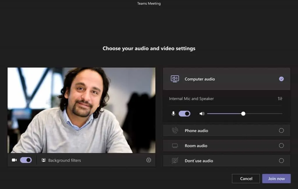 Zoals u in de onderstaande schermafbeelding kunt zien, kunnen gebruikers op het nieuwe pre-join-scherm in Microsoft Teams hun audio-, video- (camera) en apparaatinstellingen configureren voordat ze deelnemen aan de vergadering.