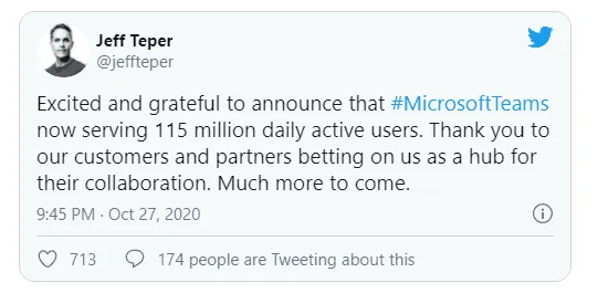 Volgens Microsoft-topman Satya Nadella telt Microsoft Teams nu 115 miljoen dagelijkse actieve gebruikers. Nadella deelde de cijfers tijdens de winstoproep van het bedrijf over het eerste kwartaal van 2021, en merkte op dat de groei van Teams is toegenomen sinds eerder dit jaar meer mensen voornamelijk vanuit huis gingen werken.