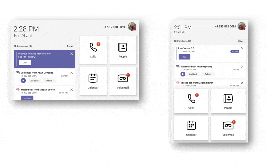 Microsoft weet dat er elke dag een groot aantal meldingen, waarschuwingen en updates wordt weergegeven – Microsoft wilde dit zo eenvoudig en gebruiksvriendelijk mogelijk maken door de interface van het startscherm opnieuw te ontwerpen. Gebruikers kunnen nu herinneringen aan uw huidige en aanstaande vergaderingen zien, snelle acties uitvoeren, zoals deelnemen aan een huidige vergadering, voicemail afspelen of gemiste oproepen rechtstreeks vanuit het startscherm beantwoorden. Een klik dieper geeft toegang tot meer gedetailleerde informatie over oproepgeschiedenis, agenda en personen.