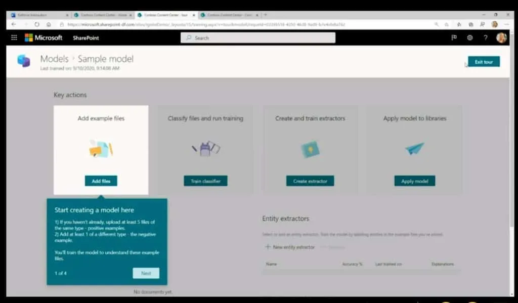 Het meest intrigerende deel van Syntex is de mogelijkheid om nieuwe modellen te trainen voor het extraheren van metadata uit documenten. Elk bedrijf heeft zijn eigen voorwaarden en categorieën. Syntex heeft een functie voor het maken van modellen waarmee u entiteiten kunt definiëren, zoals “Aannemer” of “Vergoedingbedrag”, bestaande documenten kunt markeren met labels die de waarden voor deze entiteiten identificeren, en deze kunt indienen om een model te trainen waarmee AI ze automatisch kan extraheren van nieuwe documenten.