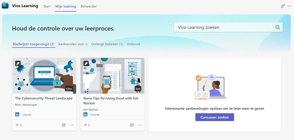 Laten we beginnen met hoe u toegang kunt krijgen tot het leermateriaal en uw leertraject kunt starten met Viva Learning,