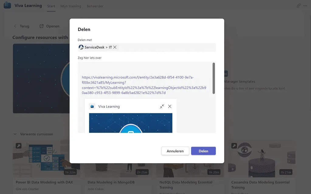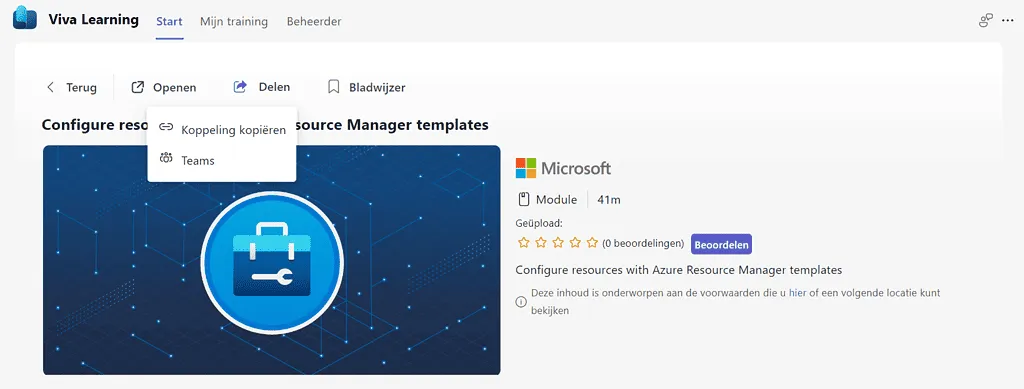 Fig 1.10 – Een leercursus delen via de kopieerlink of teams