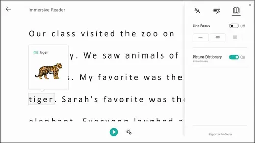 De Microsoft Immersive Reader is een gratis tool, ingebouwd in Word, OneNote, Outlook, Office Lens, Microsoft Teams, Forms, Flipgrid, Minecraft Education Edition en de Edge-browser, die bewezen technieken implementeren om het lezen en schrijven voor mensen ongeacht hun leeftijd te verbeteren. Immersive Reader creëert een leeromgeving die toegankelijk is voor lezers van alle niveaus en leeftijden. Immersive Reader helpt studenten met leerproblemen, zoals dyslexie, met behulp van oplossingen voor het decoderen van tekst en help lezers vertrouwen op te bouwen door middel van functies zoals Line Focus en Picture Dictionary.