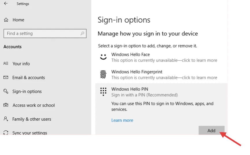 - Pincodeaanmelding activeren – sommige fouten met Windows Hello kunnen optreden wanneer pinaanmelding niet is geactiveerd. Dus als Windows Hello niet werkt, controleer dan de aanmeldingsinstellingen en voeg pincodeaanmelding opnieuw toe als optie.
