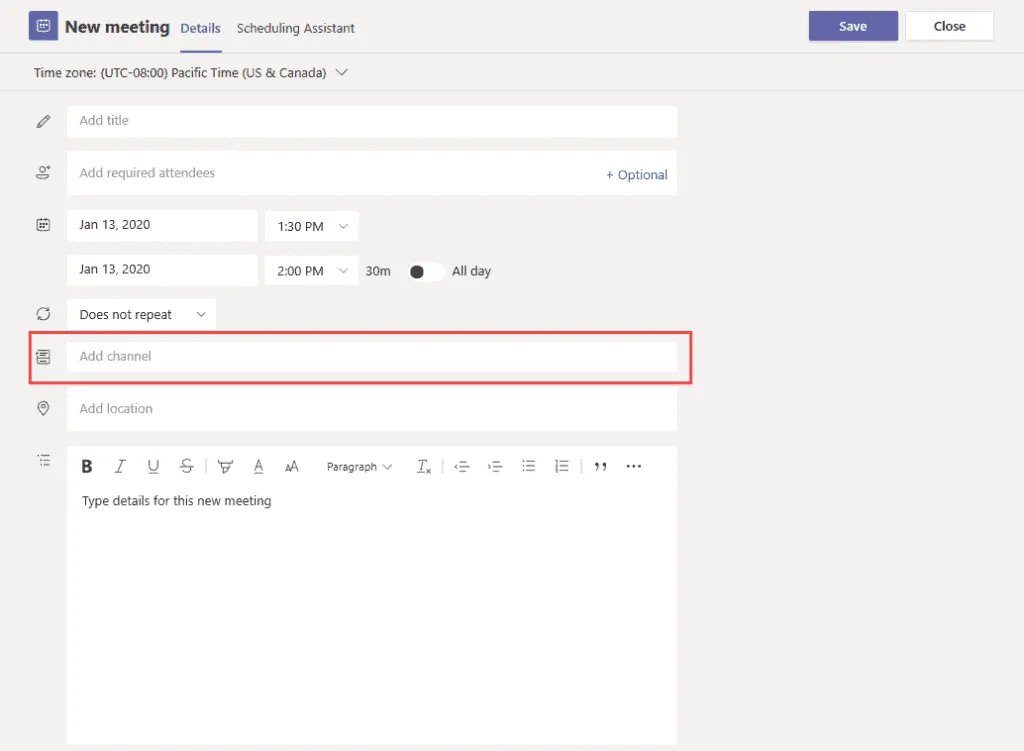 - Users cannot drag and select a time block in the channel calendar to create a channel meeting.