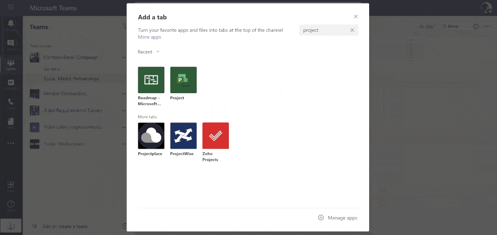 Team members can create new projects or roadmaps, or open existing ones, in Microsoft Teams, and keep communication within the context of work and collaboration within Office 365. The Project and Roadmap apps can be added as tabs in each channel by selecting the “+.” icon at the top of a channel. Anyone who has access to that channel will also have access to that tab.