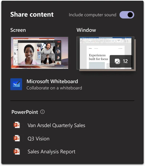 As you can see in the screenshot below, Microsoft is adding a new “Share” icon to the main menu that allows you to share content when you are in a meeting. The new Share user interface allows users to share screen, window, PowerPoint slides and whiteboard content with or without computer sound.
