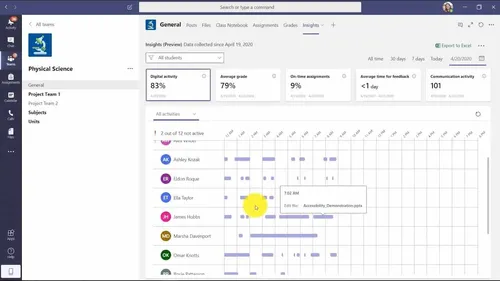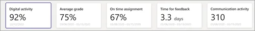 The class dashboard contains five different categories of your students’ Teams activity: digital activity, average grade, timely assignments, average feedback time, and communication activities. Use the tiles for a quick look at current averages in each category. Select a tile to see a more in-depth chart of the data in that category.