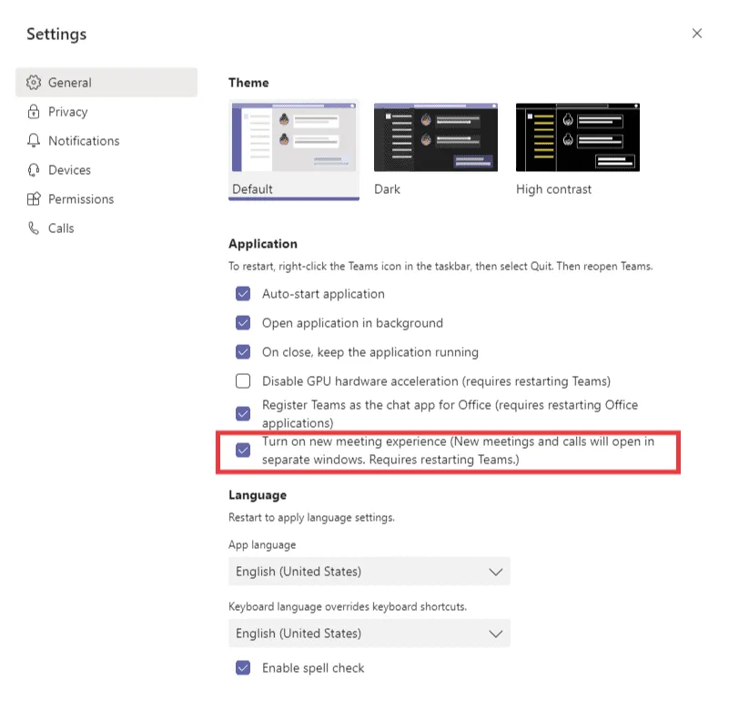 3. On the “General / General” tab, turn on the switch for “Enable new meeting experience / Turn on new meeting experience”. If the option isn’t available to you, you may need to wait a little longer as the feature is gradually rolling out.
