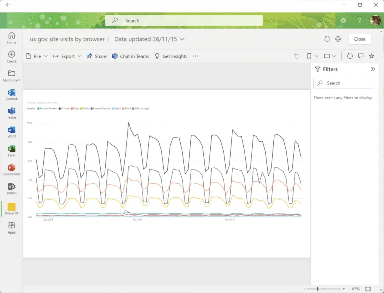 Having Power BI as a separate service with its own website means that it is not the same as using the other Office applications. The Office hub, which is both the office.com website and an app on your PC, now includes Power BI reports in the list of documents you can create, alongside Visio drawings and familiar Office documents(Figure E). You can also add the same Power BI app you use in Teams to the list of apps displayed there, such as Outlook.