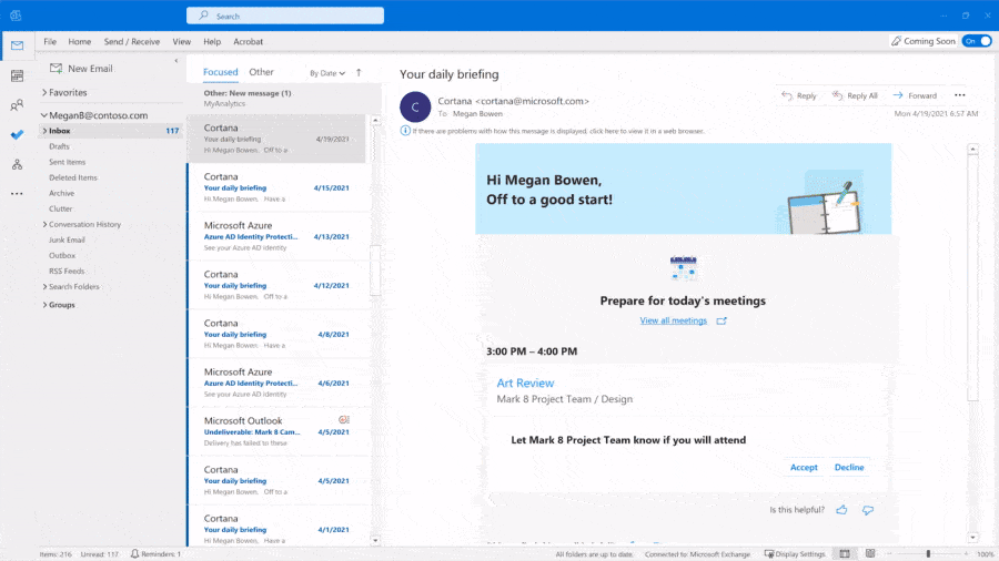 The new experience for accessing Mail, Calendar, People, and other Outlook apps, an example of which is viewed behind the Soon-to-be Available option, will become the default experience. This post is associated with Microsoft 365 Roadmap ID 88848.