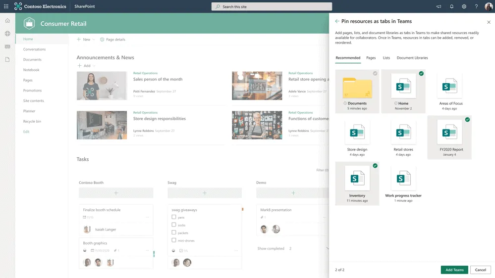 Now it’s even easier to transfer SharePoint content to Microsoft Teams and add Teams to your team site at the same time. As you connect SharePoint to Teams, choose which lists, libraries, and pages you want to bring to Teams as tabs in the new default global channel.