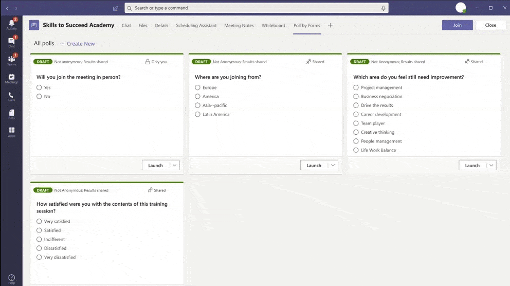 Presenters can create these polls and open them in one place under a tab in the Team Meetings. The feature is also good for quiz contests in Team meetings, and participants can start polls from mobile, internet, and desktop.