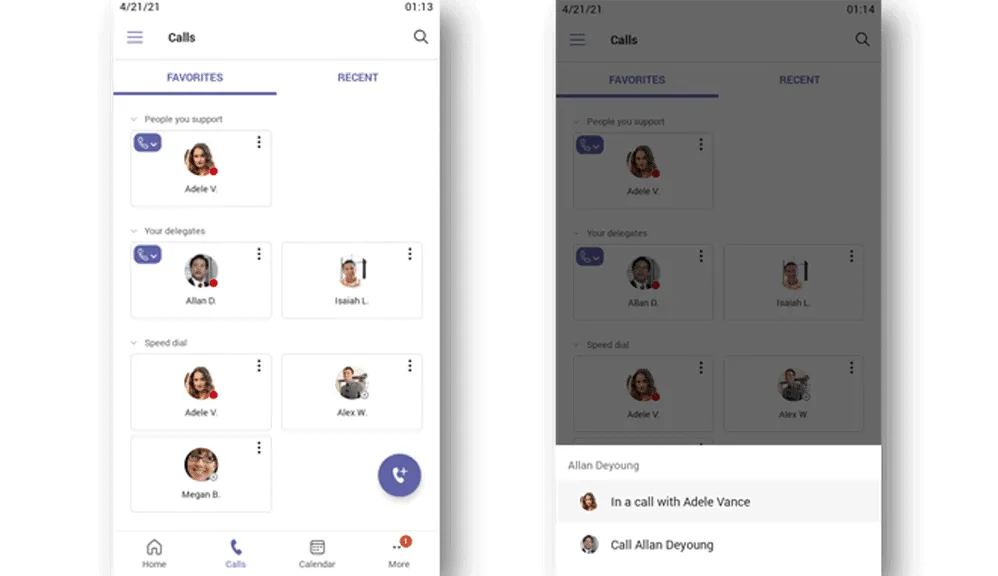When a boss or admin is on the phone, users can press the purple button to see new options related to their contacts. Now, a boss or administrator can easily see their frequent contacts with direct options to see their call status or post an outgoing call to them.