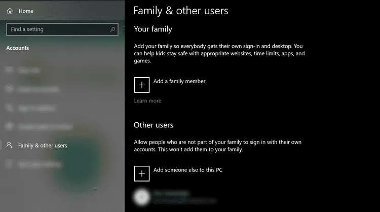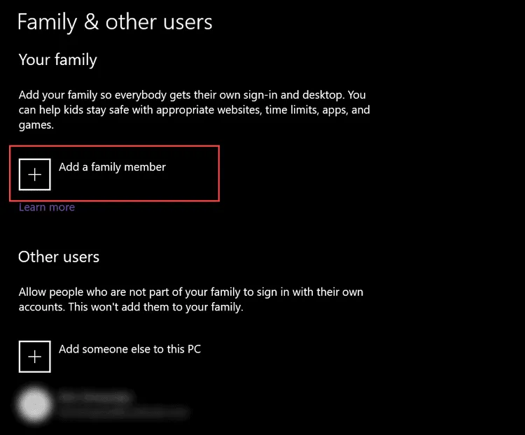 4. On this page, click the Add a family member button for Windows 10. If you are using a Windows 11 system, click Add Account.