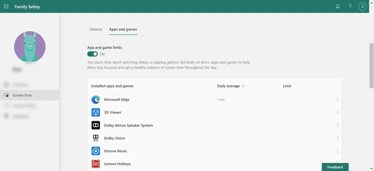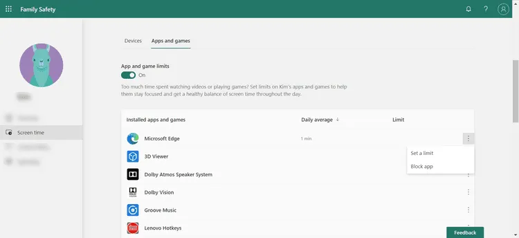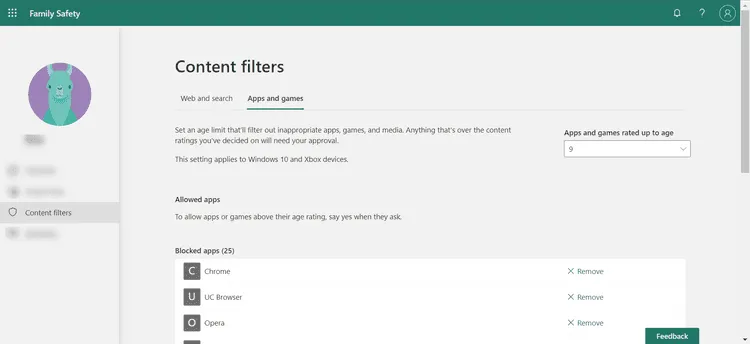 6. In the App and games tab, you can set an age limit for which apps they can download and play. You can also add which apps are allowed and blocked from using.