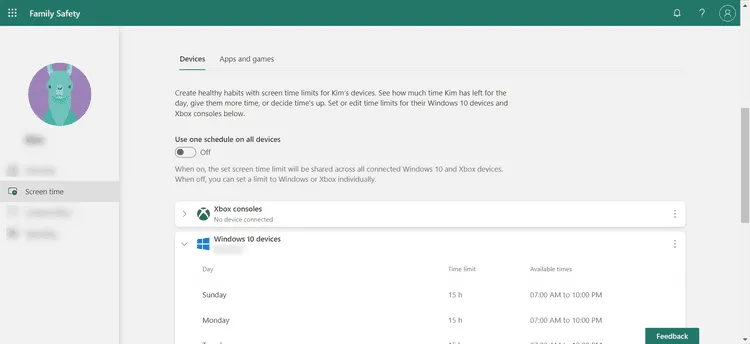 2. In the Devices tab, you have the option to restrict its use on certain devices or enable the setting to use only one schedule on all devices. To edit the time limit, click on any day in the option and change it according to the schedule you want.