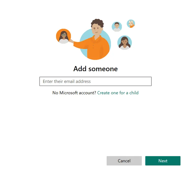 5. You will then be prompted to enter your child’s Microsoft account. If they don’t already have an account, click Create an account for a child . Otherwise, enter their email address associated with their Microsoft account.