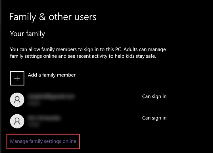 3. In the Family and other users window, click Manage Family Settings Online . You will be redirected to your Family Safety account.