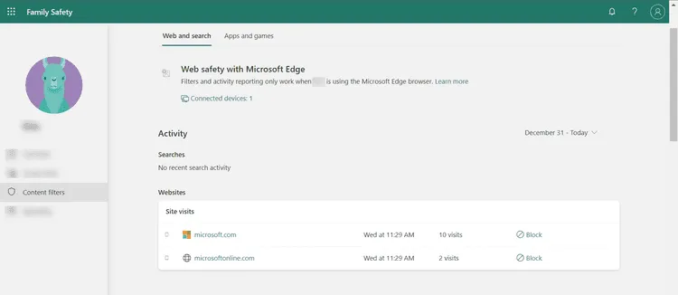 4. On the Content Filters page, you can see their search activity, how many devices are connected to the account and websites they have visited in the Web and Search tab. If you see something inappropriate, you can click the Block button and it will be automatically inaccessible to your kid’s PC.
