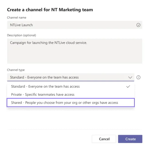 Shared channels are rolling out as part of the Teams public preview program. Team owners who are enrolled in the Teams public preview program will see shared channels as an additional channel type during channel creation. They can share the channel with anyone in the tenant.