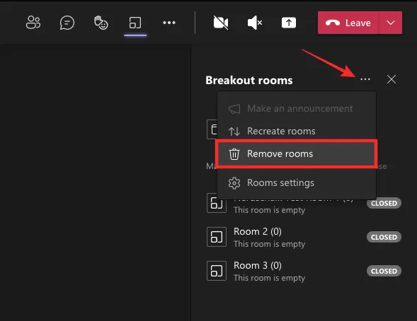If you want to delete all the rooms you created during a meeting, you can do that by clicking the three-dot icon at the top of the Breakout room sidebar and then selecting the “Delete Rooms” option from the drop-down menu.