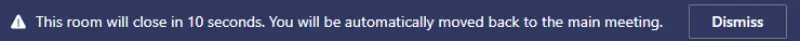 Likewise, attendees are also notified when the meeting organizer has closed the room. When you receive such a notification, you will be reassigned to the main meeting window in Microsoft Teams within 10 seconds.