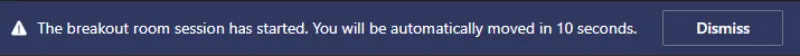 When the organizer of such a room opens the room you’re assigned to, you’ll see a notification at the top of the Teams window that says “your breakout room session has started.” When this message appears, you will be automatically moved to your assigned room within 10 seconds.