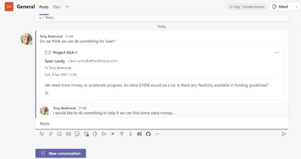 Figure 2 shows what the shared message looks like in Teams. As you can see, it looks like any other conversation base note. Comments can be posted as normal. The only shocking note is that Teams doesn’t highlight the topic of the conversation to make the topic stand out better in a topic list.