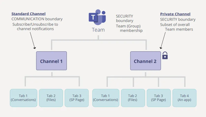 The basic shape of a workspace in Microsoft Teams has three components: the team workspace (including sharepoint file hosting), which acts as a permission limit; channels, which focus and distribute areas of focus; and tabs, which display the most important artifacts, data, and apps used by team members. Think of channels as your attention limit and the team as your membership (which has access). More about private channels and how that will come later in the game.